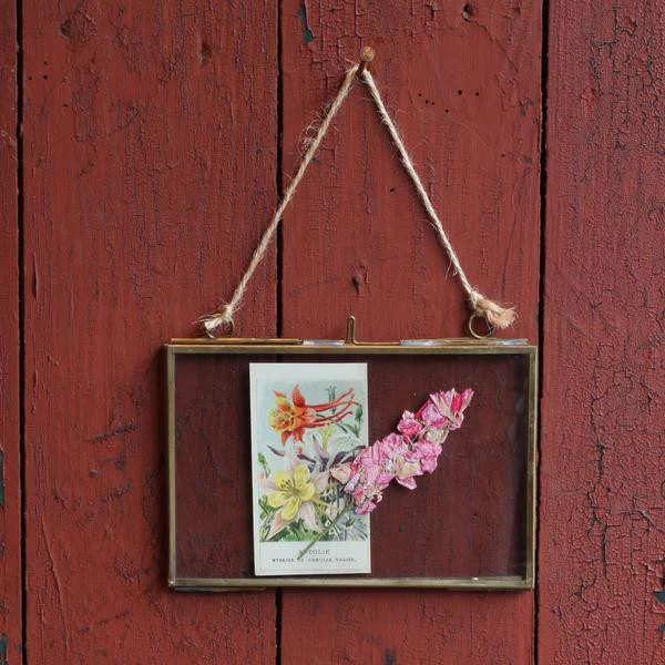 Elegant brass and glass hanging frames, perfect for photos, dried flowers and keepsakes. Available in two sizes, in both portrait and landscape. Strung with velvet ribbon.