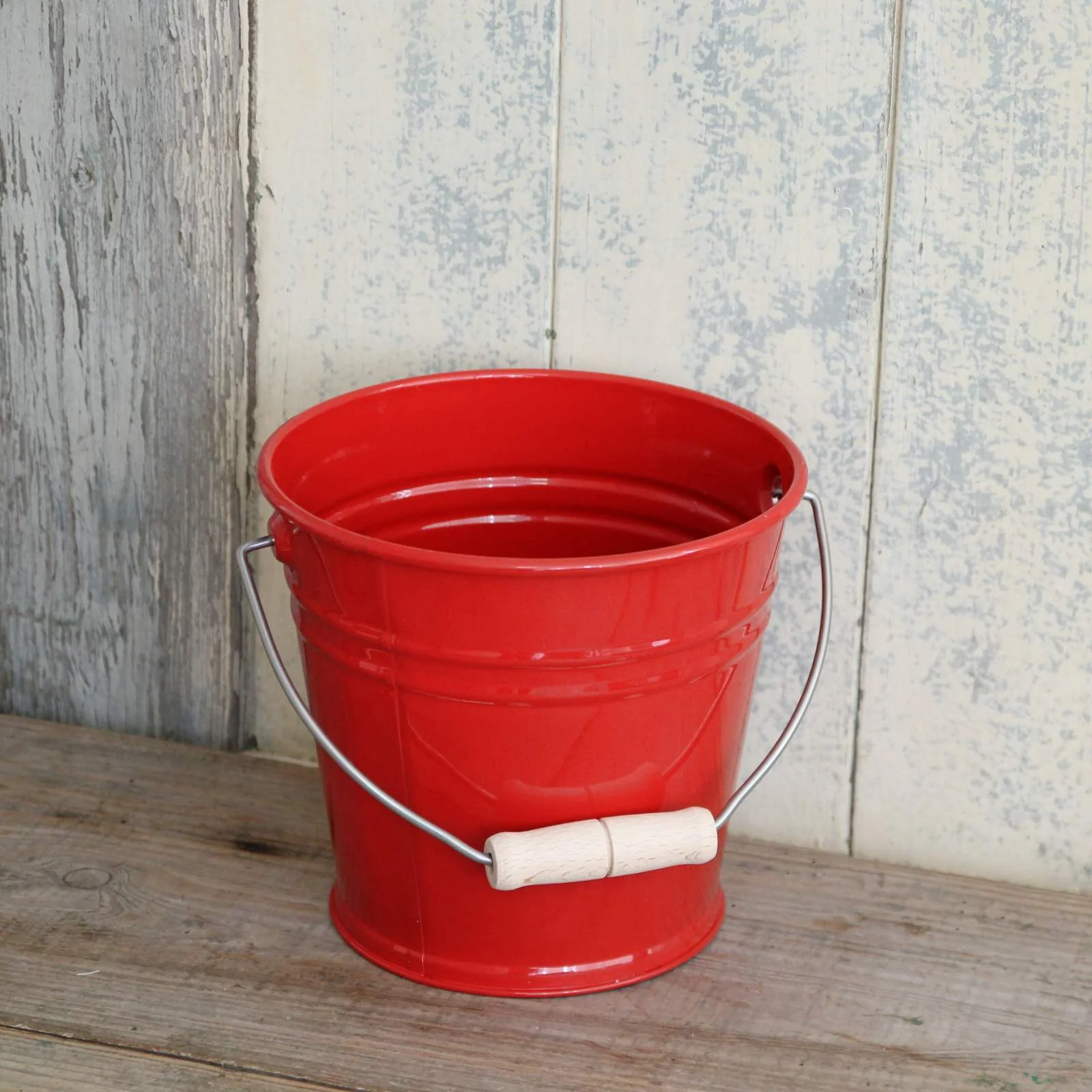 Children's red enamel bucket with wooden handle. Great for the garden or the beach