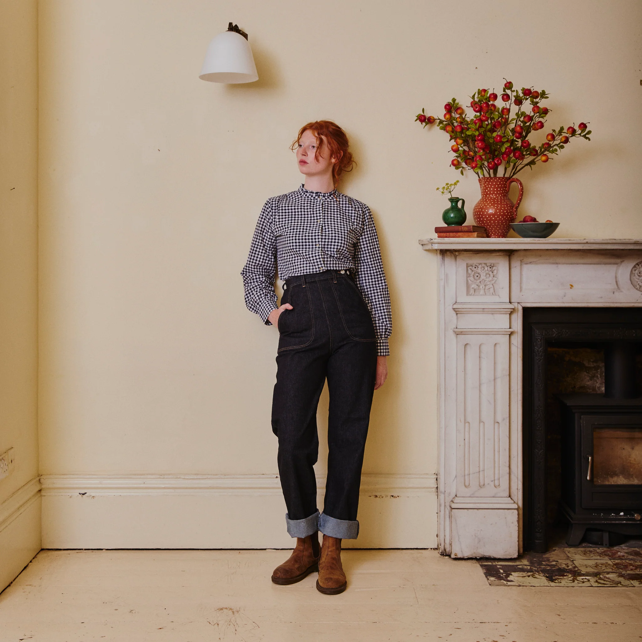 Collarless Blouse - Navy Gingham—