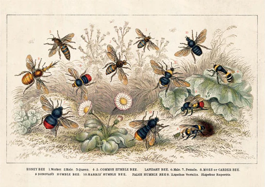 Twelve different species of bees swarming a flowery meadow. Coloured etching by J Bishop (1855), after J Stewart. Wellcome Collection. A Pattern Book and Wellcome Collection co-branded card.