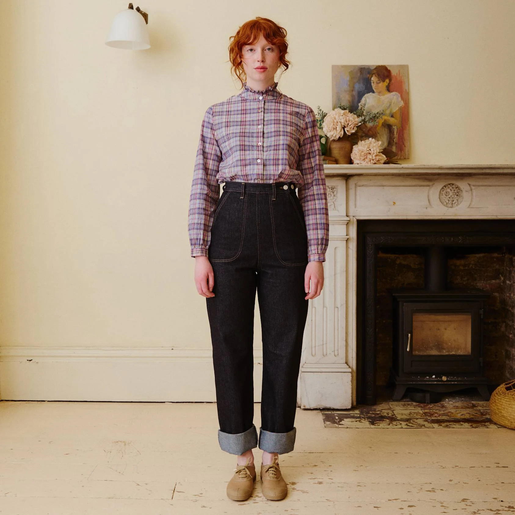 Checked blouse with a ruffle collar, pleated back and mother of pearl buttons.