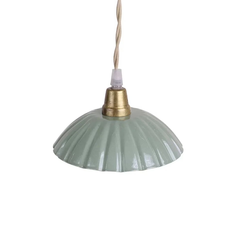 Sage green pendant lamp with a decorative lamp shade in antique finish. Beige twinned textile cord, length approx 150 cm. Fits E27, max 40W Light bulb not included.