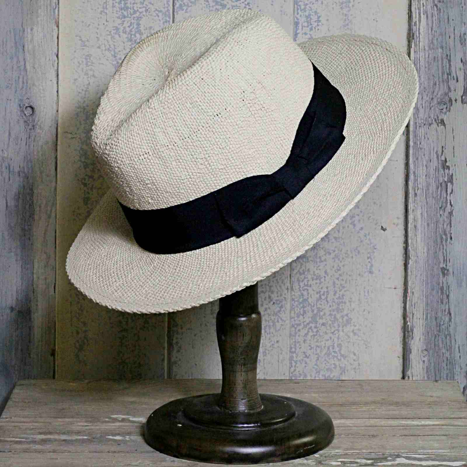 Unisex classic panama sun hat. Pale with a black band and bow detail, wth adjustable elastic inside the brim.Â
