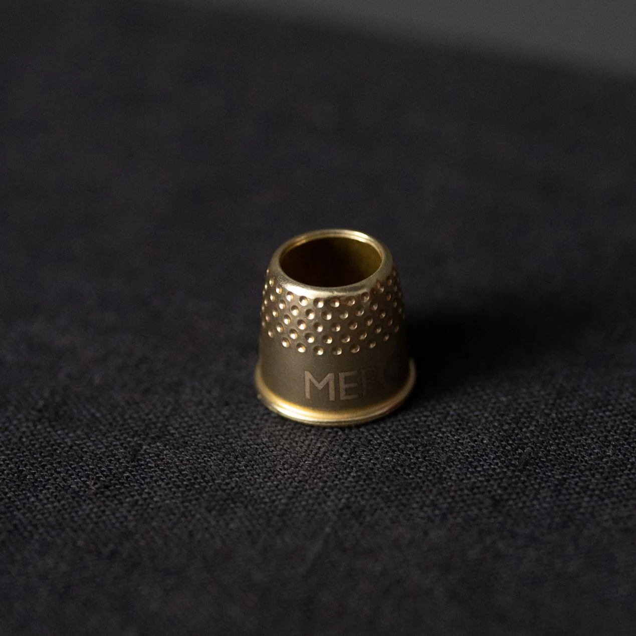 Beautifully packaged Tailor's thimble by Merchant & Mills. Solid brass tailor’s thimble with a hole at the top – engraved ‘Merchant & Mills’. The capless tailor’s thimble, you will notice, has an open top for tactile fabric control. It protects your finger without affecting dexterity. British engineered. Lacquered to prevent discolouring, size medium.