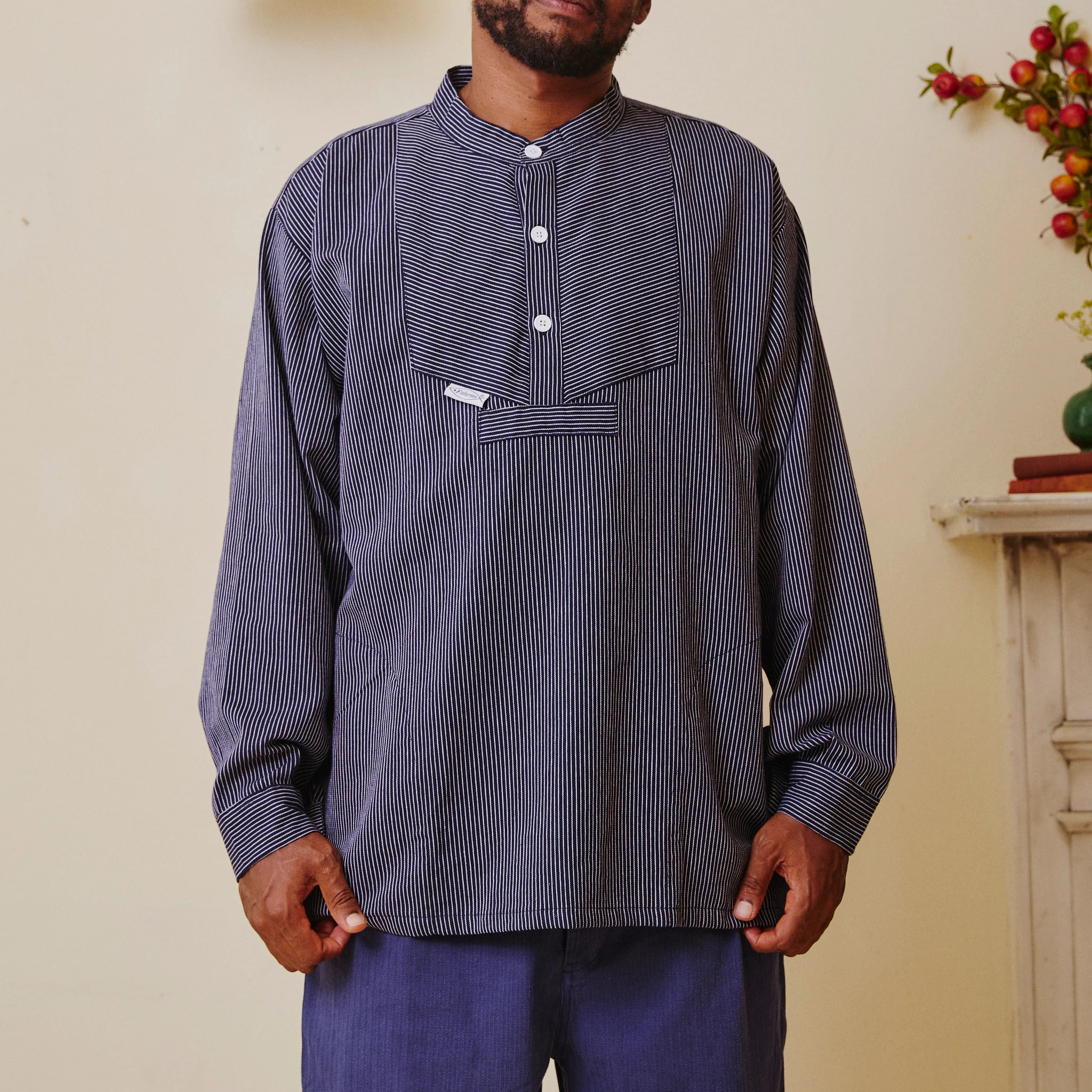 The classic fisherman collarless work shirt. Navy with narrow white stripes, button placketĀ and pockets. The excellent Fishermen brand quality stands for high-quality fabrics and first-class workmanship. The popular fisherman shirts are available for children, women and men.